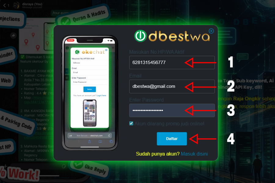 Langkahnya masih sama yaitu pertama input data sbb: Masukan No.HP/WA, Masukan Email dan Masukan Password. Kemudian klik tombol "DAFTAR PERTAHUN" dan tunggu sampai ada notifikasi berhasil melalui chat ke no.wa kamu yaa.. lihat chat masuk disana ada chat autoreply dari dbestwa yang isi chatnya untuk melakukan pembayarannya terlebih dahulu.